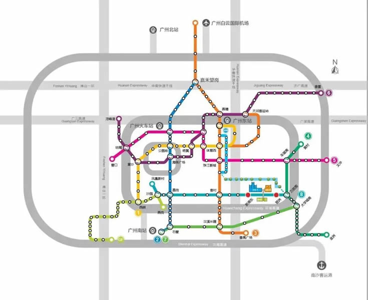 3號(hào)線(北延長(zhǎng)線)機(jī)場(chǎng)北站(2號(hào)航站樓)/機(jī)場(chǎng)南站(1號(hào)航站樓)- 體育西路站(轉(zhuǎn)乘3號(hào)線) - 客村站(轉(zhuǎn)乘8號(hào)線)- 新港東站(廣交會(huì)展館A區(qū))。