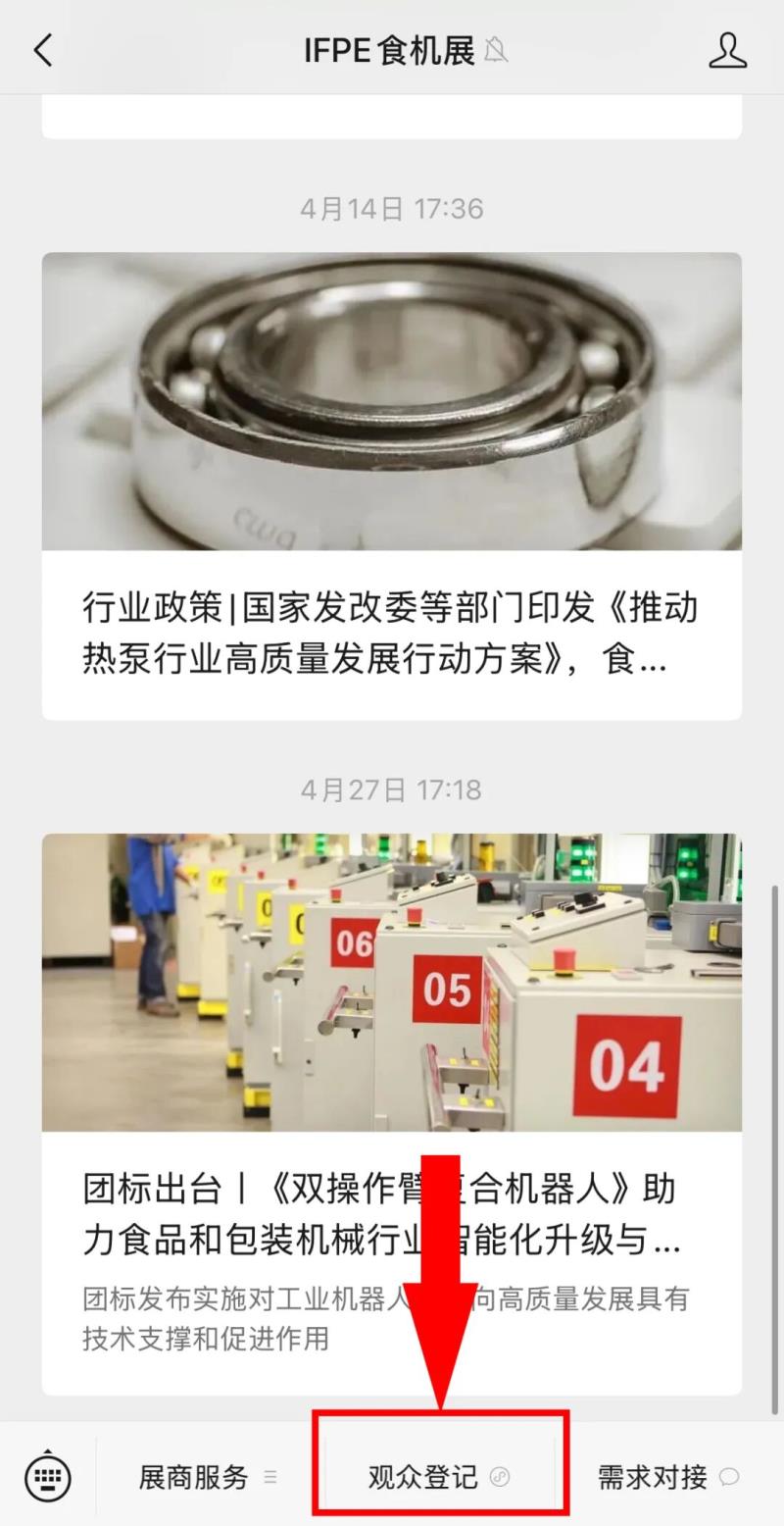 01掃碼關(guān)注公眾號(hào)STEP1:掃碼關(guān)注展會(huì)公眾號(hào)“IFPE食機(jī)展”。 |