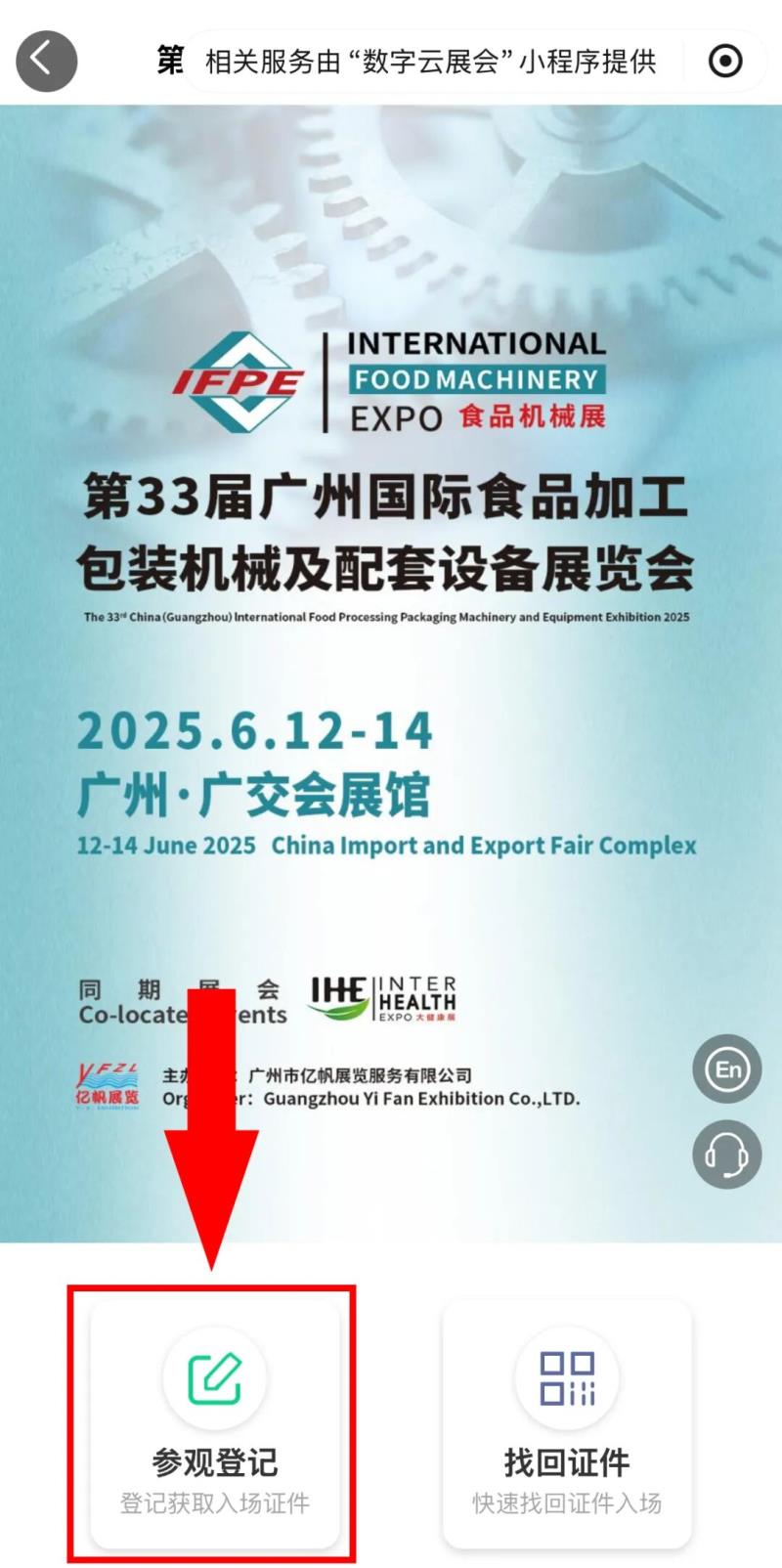 03點(diǎn)擊參觀登記STEP3:點(diǎn)擊下方“參觀登記”。 *已登記的觀眾可點(diǎn)擊右側(cè)“找回證件”,重新獲取入場(chǎng)碼。 |