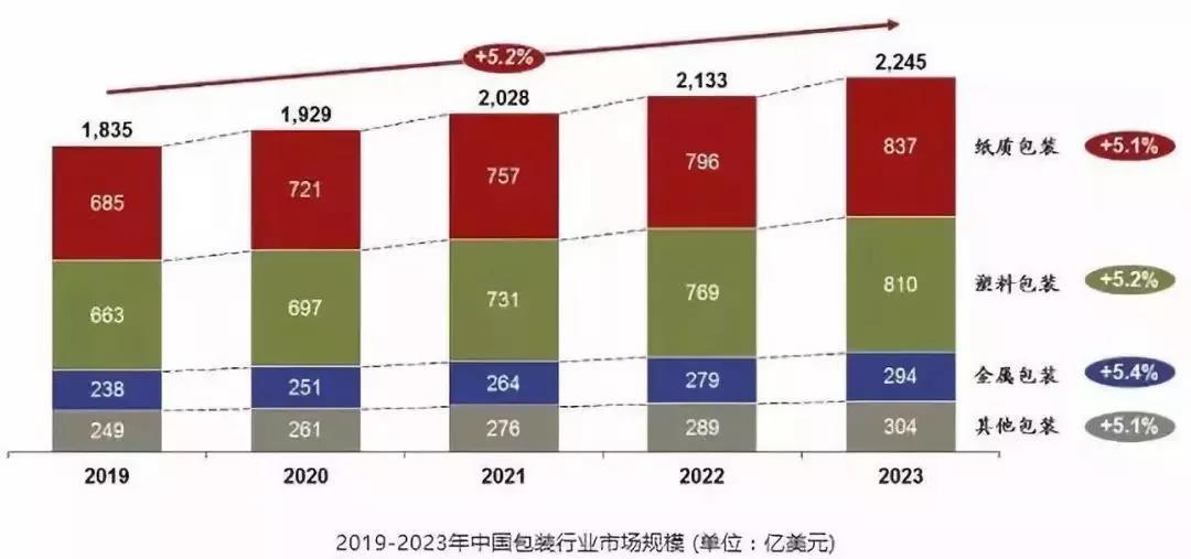 據(jù)科爾尼公司預測,2020年中國包裝行業(yè)市場規(guī)模將突破1900億美元,約占亞太市場55%的份額,并將以約5%的速度持續(xù)增長,高于全球市場約4%的整體增長預期。其中,紙質(zhì)和塑料包裝分別占比約37%,金屬占比約13%。