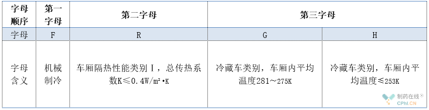醫(yī)藥冷藏車標識由三個大寫英文字母組成,各字母在標識中的含義如下: