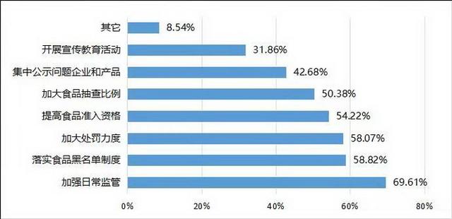 希望監(jiān)管部門如何解決食品安全問題?調(diào)查結(jié)果顯示,69.61%的受訪者希望監(jiān)管部門加強日常監(jiān)管,58.82%的受訪者希望落實食品黑名單制度,58.07%的受訪者希望加大處罰力度,54.22%的受訪者希望提高食品準入資格,50.38%的受訪者希望加大食品抽查比例,42.68%的受訪者希望集中公示問題企業(yè)和產(chǎn)品。