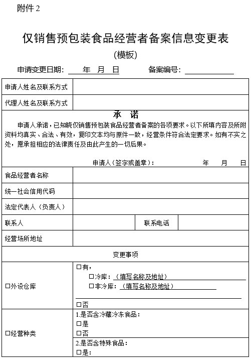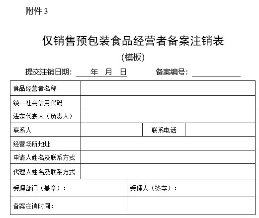 二、從事僅銷(xiāo)售預(yù)包裝食品活動(dòng)的食品經(jīng)營(yíng)者應(yīng)當(dāng)具備與銷(xiāo)售的食品品種、數(shù)量等相適應(yīng)的經(jīng)營(yíng)條件。備案時(shí),食品經(jīng)營(yíng)者應(yīng)當(dāng)填寫(xiě)《僅銷(xiāo)售預(yù)包裝食品備案信息采集表》,并提交相關(guān)文件資料及目錄。備案信息發(fā)生變化的,應(yīng)當(dāng)自發(fā)生變化之日起15個(gè)工作日內(nèi)向原實(shí)施備案的市場(chǎng)監(jiān)管部門(mén)提交《僅銷(xiāo)售預(yù)包裝食品備案信息變更表》、與變更項(xiàng)目有關(guān)的文件資料和目錄進(jìn)行備案變更。終止食品經(jīng)營(yíng)活動(dòng)的,應(yīng)當(dāng)自經(jīng)營(yíng)活動(dòng)終止之日起15個(gè)工作日內(nèi),向原備案的市場(chǎng)監(jiān)管部門(mén)注銷(xiāo)備案。未及時(shí)注銷(xiāo)備案的,市場(chǎng)監(jiān)管部門(mén)可注銷(xiāo)備案。食品經(jīng)營(yíng)者主體資格依法終止的,備案自動(dòng)失效。