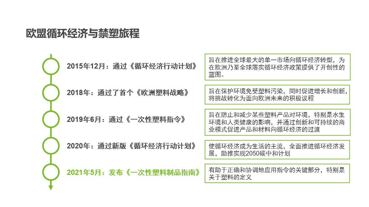 當(dāng)我們回溯歐盟的相關(guān)法令可以發(fā)現(xiàn),從2015年的《循環(huán)經(jīng)濟(jì)行動(dòng)計(jì)劃》到《歐洲塑料戰(zhàn)略》、《一次性塑料法令》等等,對(duì)塑料的使用、限制都在一步步加強(qiáng),歐盟通過(guò)推廣環(huán)保新材料、開(kāi)征塑料稅、制定碳中和目標(biāo)、重新定義塑料范疇等不同方式,力圖對(duì)塑料的生產(chǎn)、使用、消費(fèi)、回收形成一個(gè)閉環(huán)的管理和引導(dǎo)。