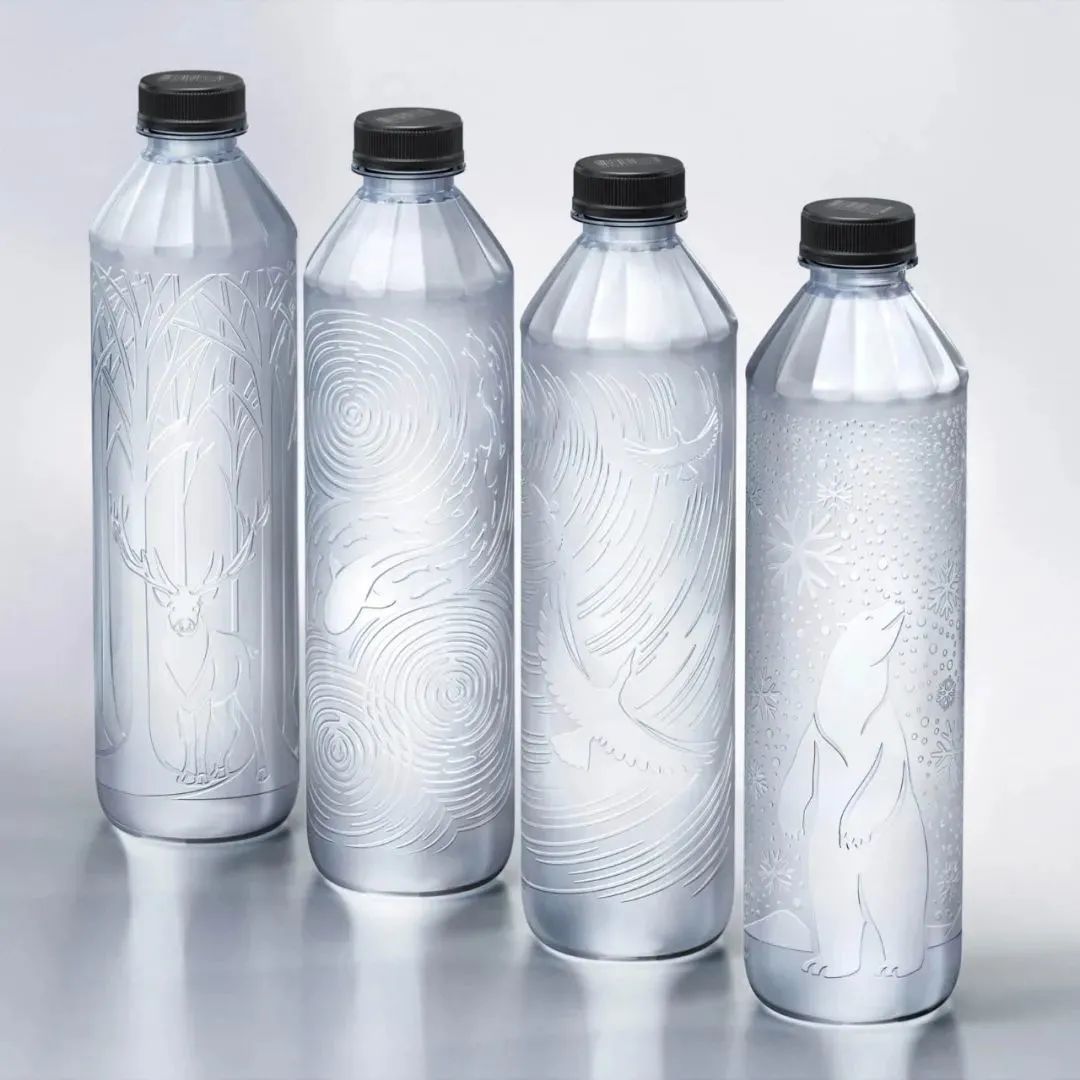 以依云的無標(biāo)簽瓶為例,其品牌LOGO和基本的標(biāo)簽信息是模內(nèi)壓印刻入瓶身的。