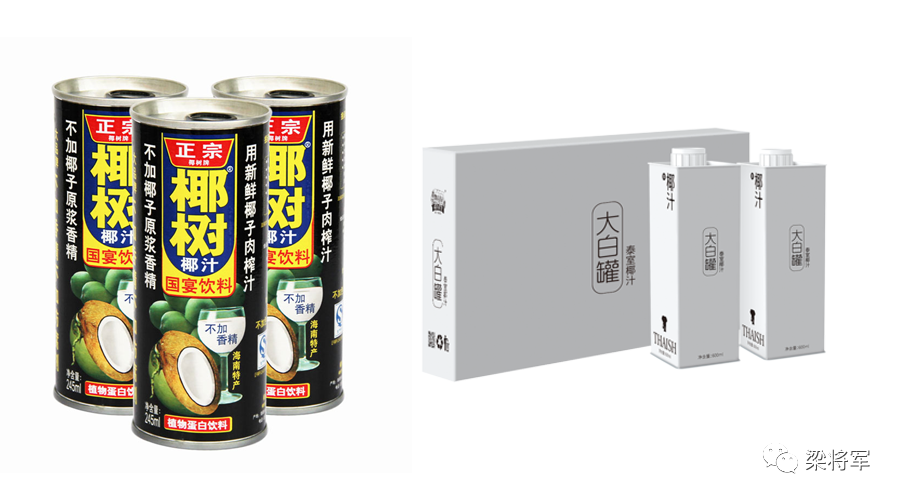 椰樹椰汁粗暴的大字報風格,紅黃黑配色,很多網(wǎng)友直呼它“辣眼睛”。大白罐包裝極簡風、小清新,視覺觀感明顯更高級。
