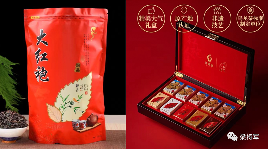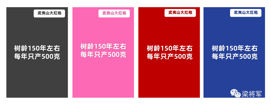 只要智商正常的人,都會選擇右邊的包裝。因為這款包裝上加上的那句“樹齡150年左右,每年只產(chǎn)500克”,很高級地傳遞出了這款大紅袍是多么的珍貴。