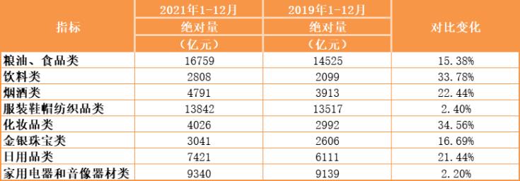 線上、線下方面,2021年線上消費額較2020年增速同比提升11.29%,較2019年大增23.1%,可見隨著疫情的爆發(fā)及常態(tài)化趨勢,線上消費習慣進一步普及與深化;但線下消費則不太樂觀,2021年相較2019年僅微增1.51%,基本持平。