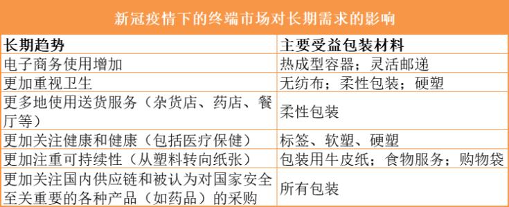 因為消費結構的變化,導致終端消費市場對包裝也產(chǎn)生了直接影響。麥肯錫調(diào)查了美國疫情下的終端市場對長期需求的影響。疫情加速讓全球轉(zhuǎn)向電子商務,也推動了包裝尺寸的變化,消費者對包裝和廢棄物的感知,以及更便利的包裝設計。