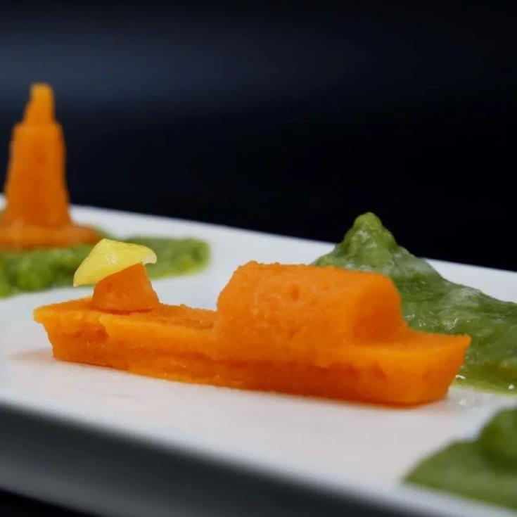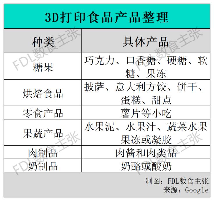 目前,3D食品打印所用到的食材可以從組成成分的角度,大致歸納為五大類:碳水化合物、脂肪、蛋白質(zhì)、膳食纖維以及功能成分,F(xiàn)DL數(shù)食主張選取了以下海內(nèi)外代表性案例展開介紹: