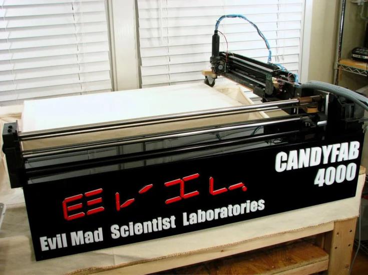 于是乎,從2007至2009年,位于美國加州的一個小型機械實驗機構(gòu)Evil Mad Scientist Laboratories就成功建造出三臺DIY 3D打印機CandyFab 4000、5000和6000。據(jù)悉,CandyFab系列機器能夠使用一種稱為選擇性熱空氣燒結(jié)和熔化 (SHASAM) 的新工藝,通過將糖粒與熱空氣一起熔化,從而在低成本下用純糖打印出食品。