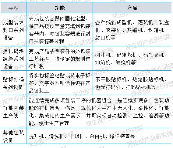 食品包裝機(jī)械包含了食品加工制造機(jī)械和包裝設(shè)備,其中食品機(jī)械主要可分為液態(tài)包裝及乳制品裝備、釀酒裝備、肉類加工裝備、飲料裝備、烘焙糖制品裝備、調(diào)味品裝備、食品安全檢測裝備等類別。包裝是商品進(jìn)入流通領(lǐng)域的必要條件,而包裝設(shè)備是實(shí)現(xiàn)產(chǎn)品包裝的主要手段。按照工序劃分,包裝設(shè)備可以劃分為成型裝填封口系列設(shè)備、捆扎碼垛纏繞系列設(shè)備、貼標(biāo)打碼系列設(shè)備、智能包裝生產(chǎn)線及其他設(shè)備五類,如下表所示。