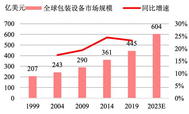 全球包裝設(shè)備行業(yè)規(guī)模接近500億美元,其中食品、飲料以及醫(yī)療為最主要下游應(yīng)用領(lǐng)域。根據(jù)The Freedonia Group,Inc報(bào)告,2019年全球包裝設(shè)備市場規(guī)模約445億美元,并預(yù)計(jì)在2023年達(dá)到604億美金,預(yù)計(jì)整體保持5%左右的年均增速。從地區(qū)來看,根據(jù)其預(yù)測發(fā)展中國家和地區(qū)包裝設(shè)備銷量的增長將成為全球包裝設(shè)備發(fā)展的推動(dòng)力,中國作為最大的發(fā)展中國家,對(duì)包裝設(shè)備的需求將構(gòu)成世界最大的市場之一;從下游應(yīng)用領(lǐng)域來看,2019年全球包裝設(shè)備機(jī)械中前三大終端應(yīng)用領(lǐng)域分別為食品、飲料、醫(yī)療,分別占33.5%、24.0%、12.0%。