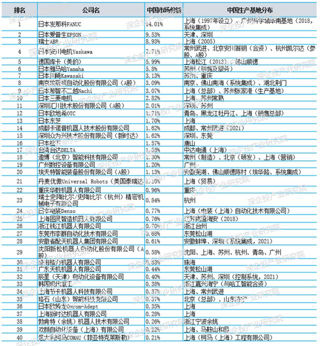 2020年我國(guó)工業(yè)機(jī)器人前40名企業(yè)的基地分布如下表所示。