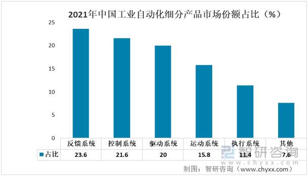 從2021年年中國工業(yè)自動化細分產(chǎn)品市場份額占比情況來看,反饋系統(tǒng)、控制系統(tǒng)、驅(qū)動系統(tǒng)占比分別為23.6%、21.6%、20%,運動系統(tǒng)、執(zhí)行系統(tǒng)占比分別為15.8%、11.4%。