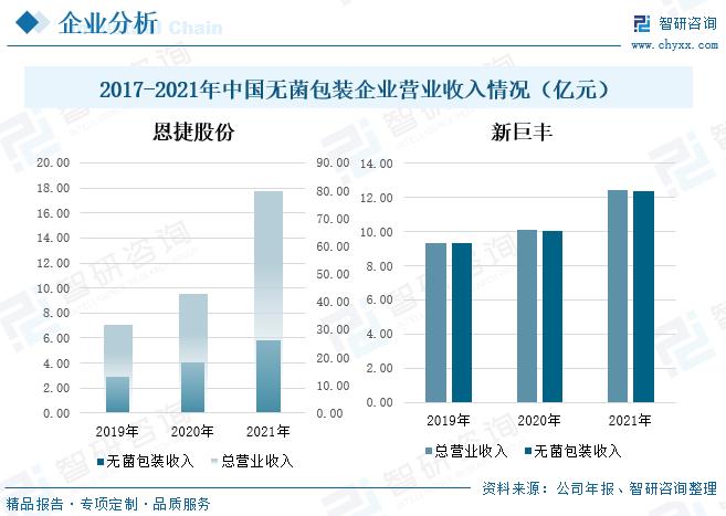 恩捷股份是全球領(lǐng)先的鋰電池隔膜行業(yè)龍頭,無菌包裝使其公司的產(chǎn)品的之一,從營(yíng)業(yè)收入來看,2019-2021年,公司的營(yíng)業(yè)收入處于不斷增長(zhǎng)的狀態(tài),其中無菌包裝的收入也從2019年的2.89億元增加到2021年的5.78億元。新巨豐是一家以無菌包裝的研發(fā)、生產(chǎn)與銷售為主營(yíng)業(yè)務(wù)的公司,無菌包裝收入是其主要的收入來源,從企業(yè)營(yíng)業(yè)收入來看,2021年,新巨豐的總營(yíng)業(yè)收入為12.42億元,其中無菌包裝的收入達(dá)到了12.35億元。